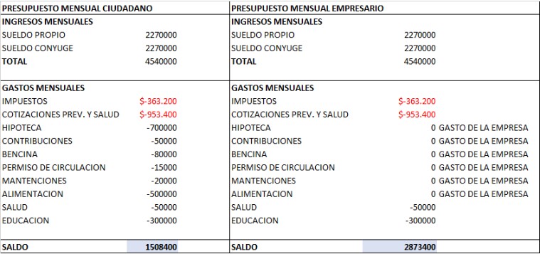 Así pues, el lugar donde funciona la fábrica, establecimiento comercial o sucursal, los vehículos de la empresa, los contratos de los trabajadores, hasta la casa que habitan y el auto que manejan, todo, está a nombre de la o las respectivas sociedades, por lo que todos los impuestos que gravan a esos bienes se consideran gastos necesarios para producir la renta. Es decir, no tributan. Igual tratamiento reciben los desembolsos que esos bienes generan. (art. 31. ley de renta). También, el empresario y su cónyuge o conviviente civil pueden pagarse un sueldo, denominado empresarial o patronal, hasta el tope imponible cada uno (hoy, de 2,27 millones de pesos aprox.) y deducirlo como gasto de la empresa.